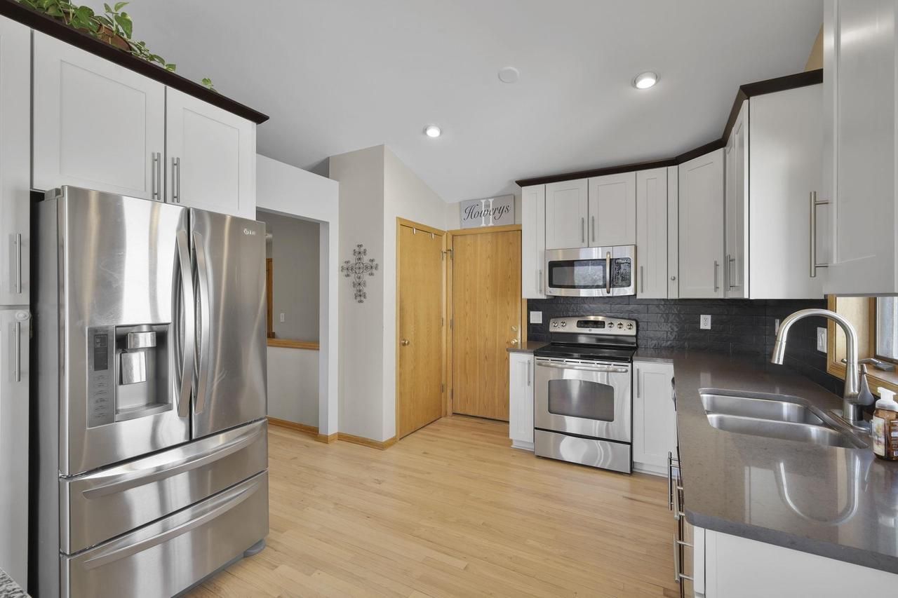Showings start 3/5. Highly functional floor plan & fresh, modern updates throughout! The main living area welcomes you with newly refinished hardwood floors & soaring vaulted ceilings, creating a bright open feel anchored by a floor-to-ceiling stone gas FP. Stylishly updated bathrooms & a stunning kitchen elevate the home's appeal, while the finished walk-out LL expands your living options w/ room for guests. The exposed unfinished space provides ample storage & opportunity for future expansion. Outdoor living is equally impressive with a patio complete w/ a hot tub & built-in firepit for year-round enjoyment, plus a deck overlooking the nicely landscaped fenced-in yard. Major updates provide peace of mind, including a new roof (2025), newer mechanicals, fresh paint, & new ML bdrm carpet.