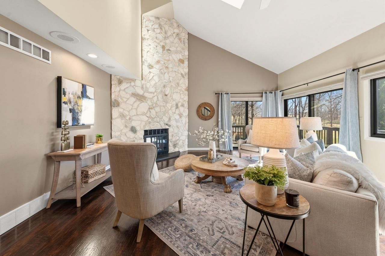 An open floor plan & serene views await you at this 2-story townhouse condo with LL walk out. Generous living room with vaulted ceilings, skylights, towering natural stone fireplace & newer Renewal by Anderson windows and sliding doors. A wrap around deck overlooks the wooded backyard & North Hills Country Club golf course. Stylish kitchen w/ eat-in & convenient access to attached garage. Large main floor bedroom, updated full bath and convenient laundry. The upstairs primary bedroom is an oasis with ensuite bath, WIC & private balcony! Nice nearby third bedroom. Lower level features a rec room with electric FP, wet bar, beverage fridge and sliders to patio. Additional office/play space & full bath. Lots of storage. Lives like a single-family home with the conveniences of a condo!